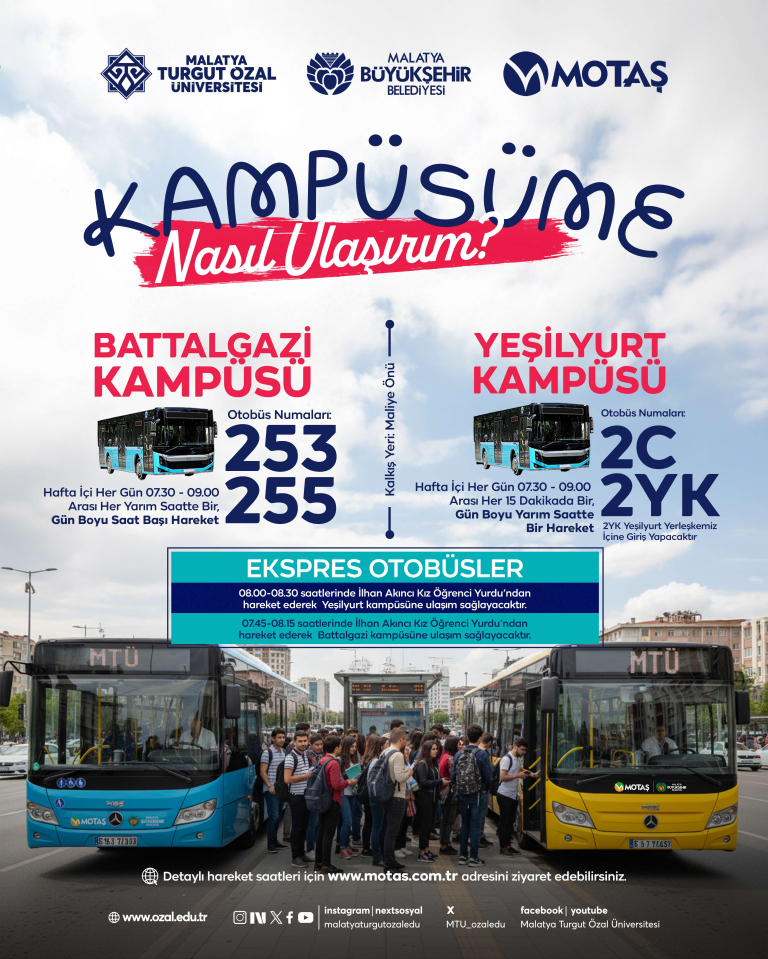Malatya Turgut Özal Üniversitesi öğrencilerimiz için Battalgazi ve Yeşilyurt Kampüslerine ulaşım, Malatya Büyükşehir Belediyesi ve MOTAŞ iş birliğiyle düzenlenen otobüs seferleriyle sağlanmaktadır. 🚌 Battalgazi Kampüsü Otobüs Numaraları: 253 – 255 Kalkış Yeri: Maliye Önü Sefer Aralığı: Hafta içi her gün 07.30 – ...