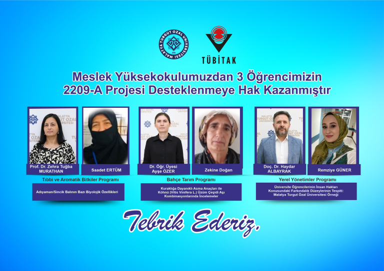 Üniversitemiz Malatya Turgut Özal Üniversitesi Bttalgazi Meslek Yüksekokulu bünyesinde eğitim gören üç öğrencimiz, TÜBİTAK tarafından desteklenen 2209-A Üniversite Öğrencileri Araştırma Projeleri Destekleme Programı kapsamında destek almaya hak kazanmıştır.